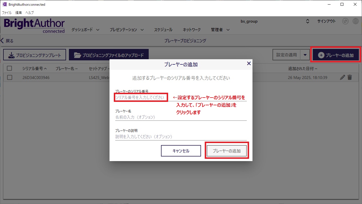 6.「プレーヤーのシリアル番号」に設定するプレーヤーのシリアル番号を入力します(必須)。