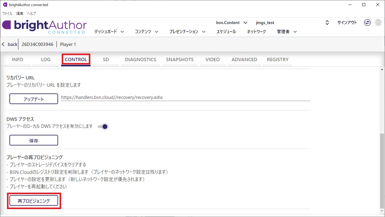 10.「CONTROL」タブを選択し、「再プロビジョニング」をクリックします。プレーヤーが再起動し、再設定を行います。
